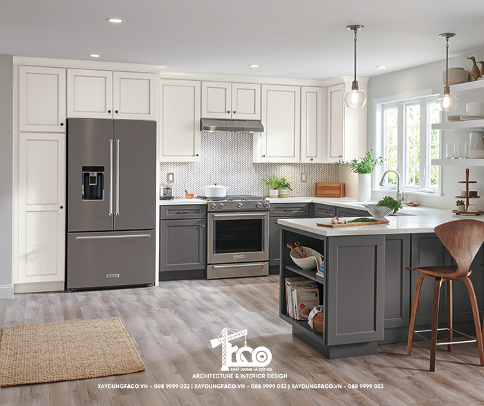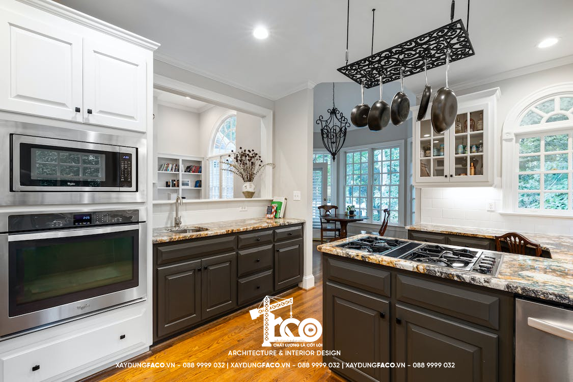 Phòng bếp là nơi có giá trị sum họp, gắn kết tình cảm các thành viên trong gia đình. Chính vì vậy, không gian phòng bếp phải thật ấm cúng và gần gũi, tạo cảm hứng trong việc nấu nướng cho người vợ, người mẹ. Các nội thất bày trí trong phòng bếp nên ưu tiên các chất liệu cao cấp, bền đẹp như: Gỗ óc chó, gỗ sồi,… Chất liệu này sẽ góp phần mang lại sự ấm cúng, thân thuộc cho gian bếp. Ngoài ra, nên sử dụng các loại đá tự nhiên, đá nhân tạo có khả năng chịu nhiệt tốt để làm: Mặt kệ bếp, đảo bếp, mặt bàn ăn,… tạo vẻ đẹp sang trọng.