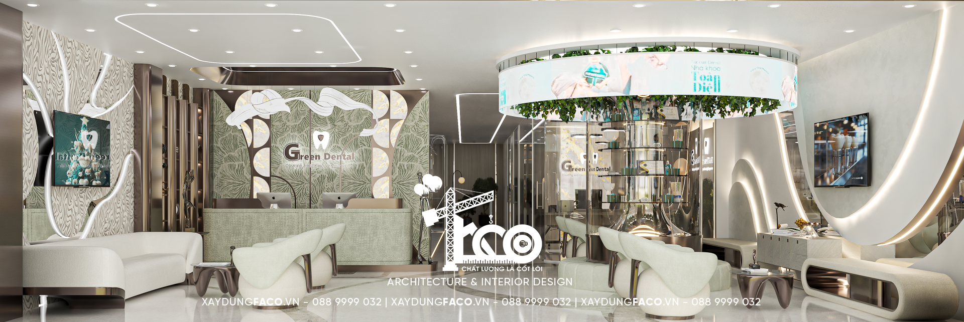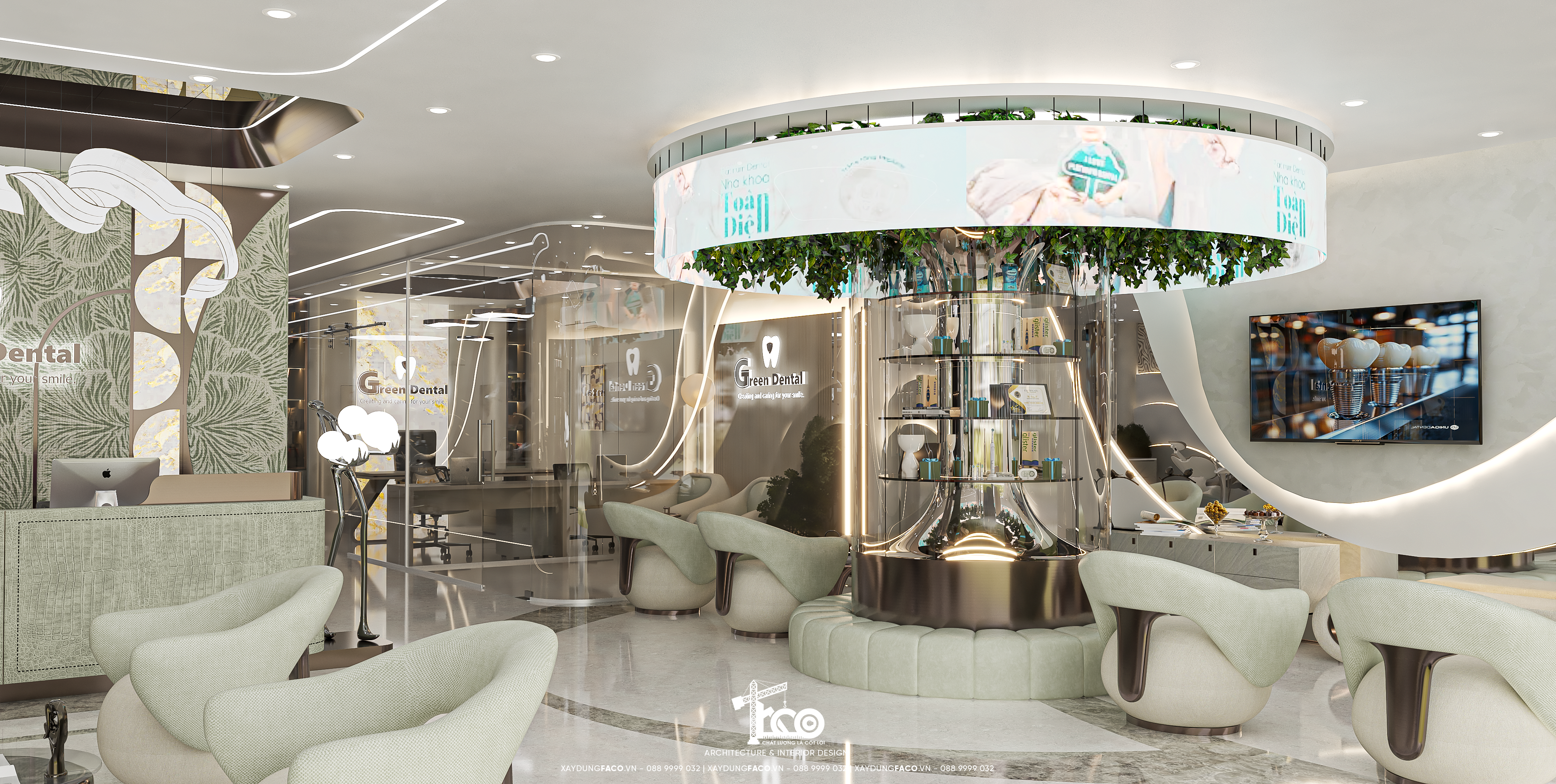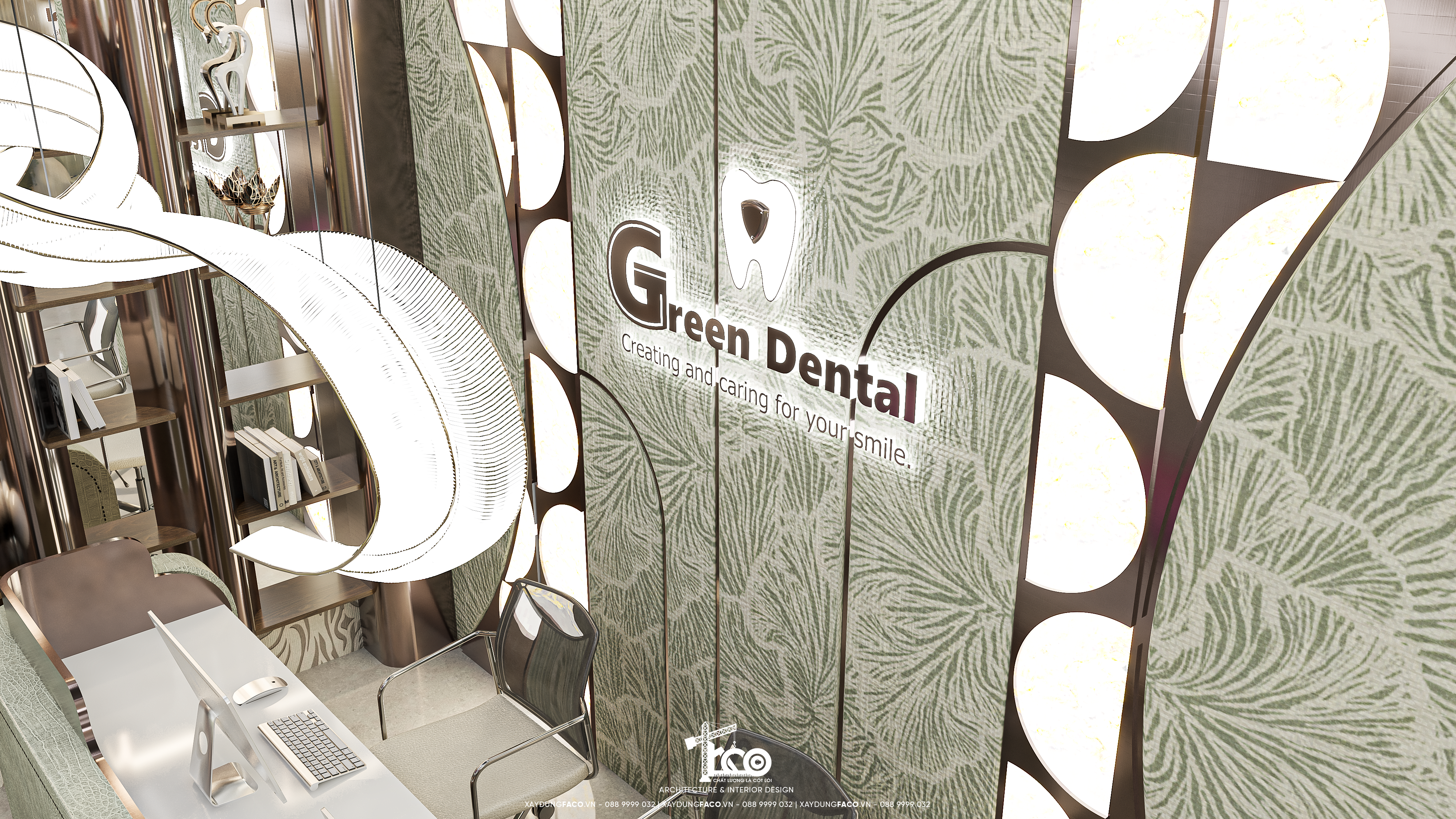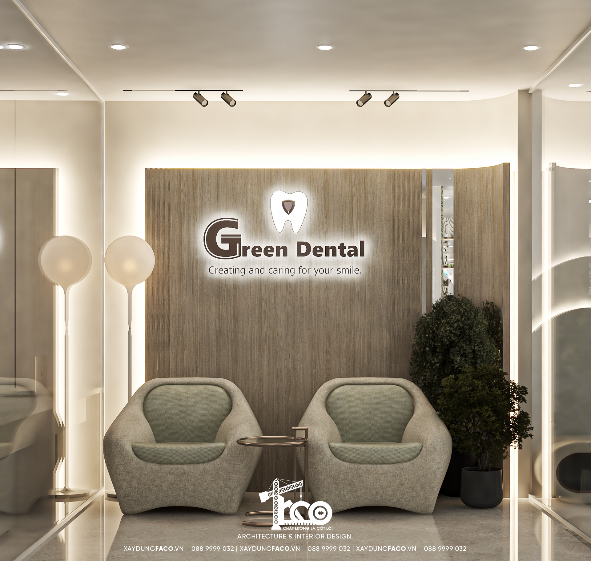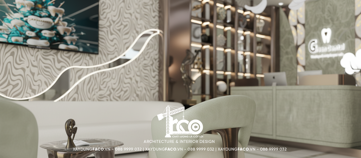 Với đội ngũ nhân sự chuyên môn cao và nhạy bén trong việc nắm bắt xu hướng của Faco Design & Build, chúng tôi không chỉ xây dựng các mảng tường, hơn cả, chúng tôi kiến tạo cảm xúc. Và Green Dental chính là một trong những minh chứng cho việc tạo ra không gian y tế chuẩn mực hoàn toàn có thể đẹp như một khách sạn 5 sao.