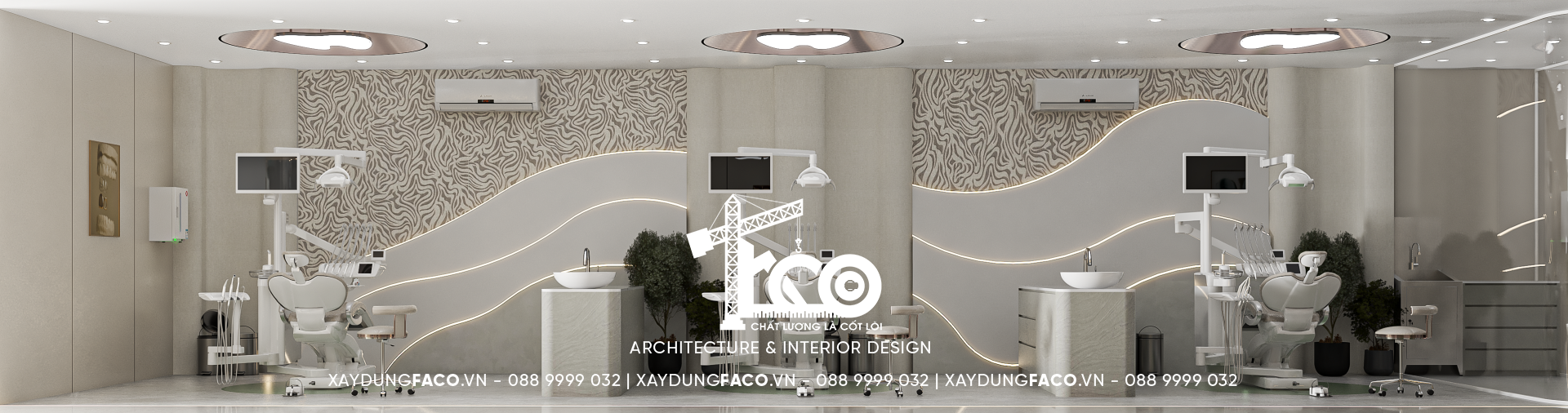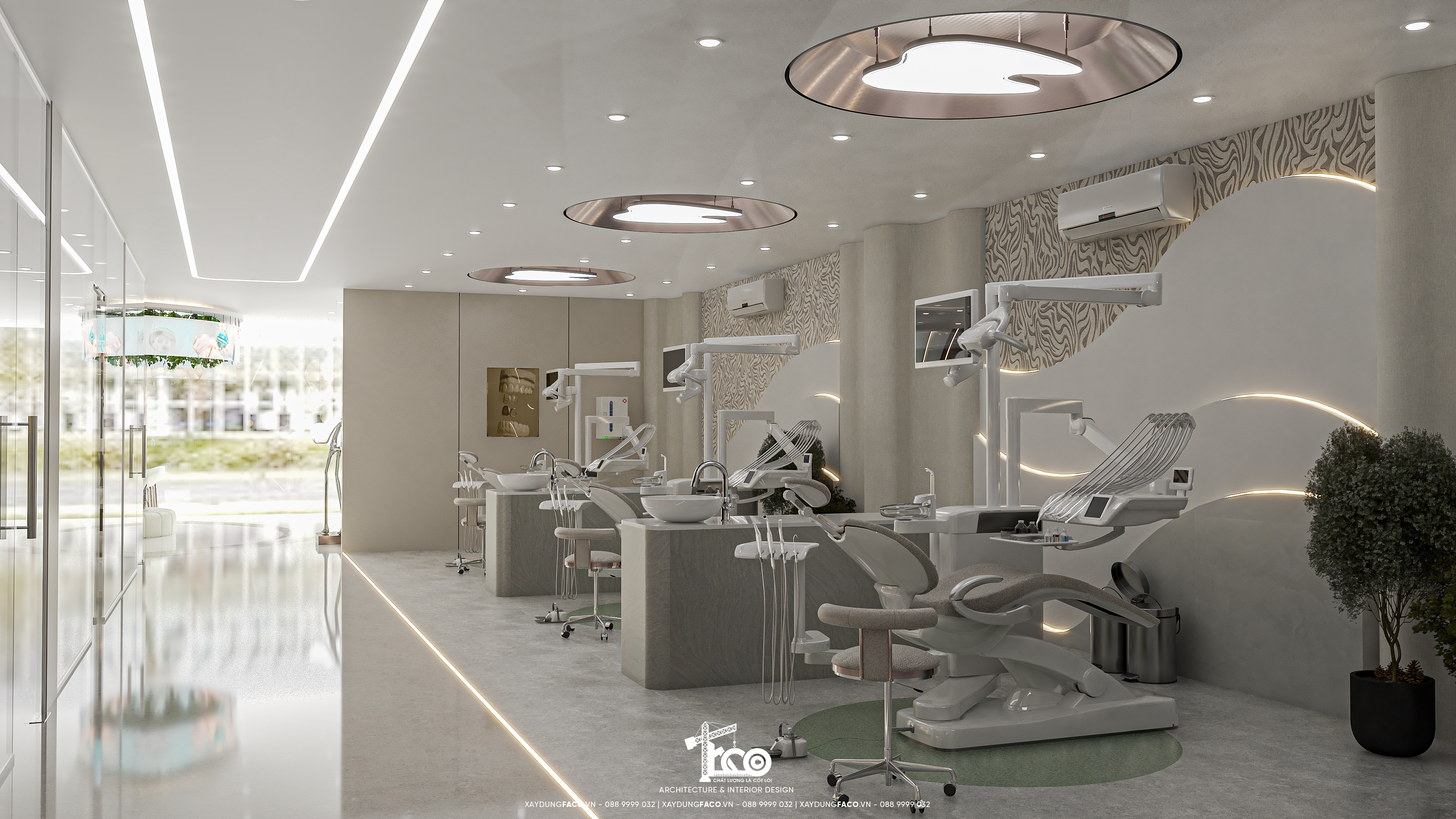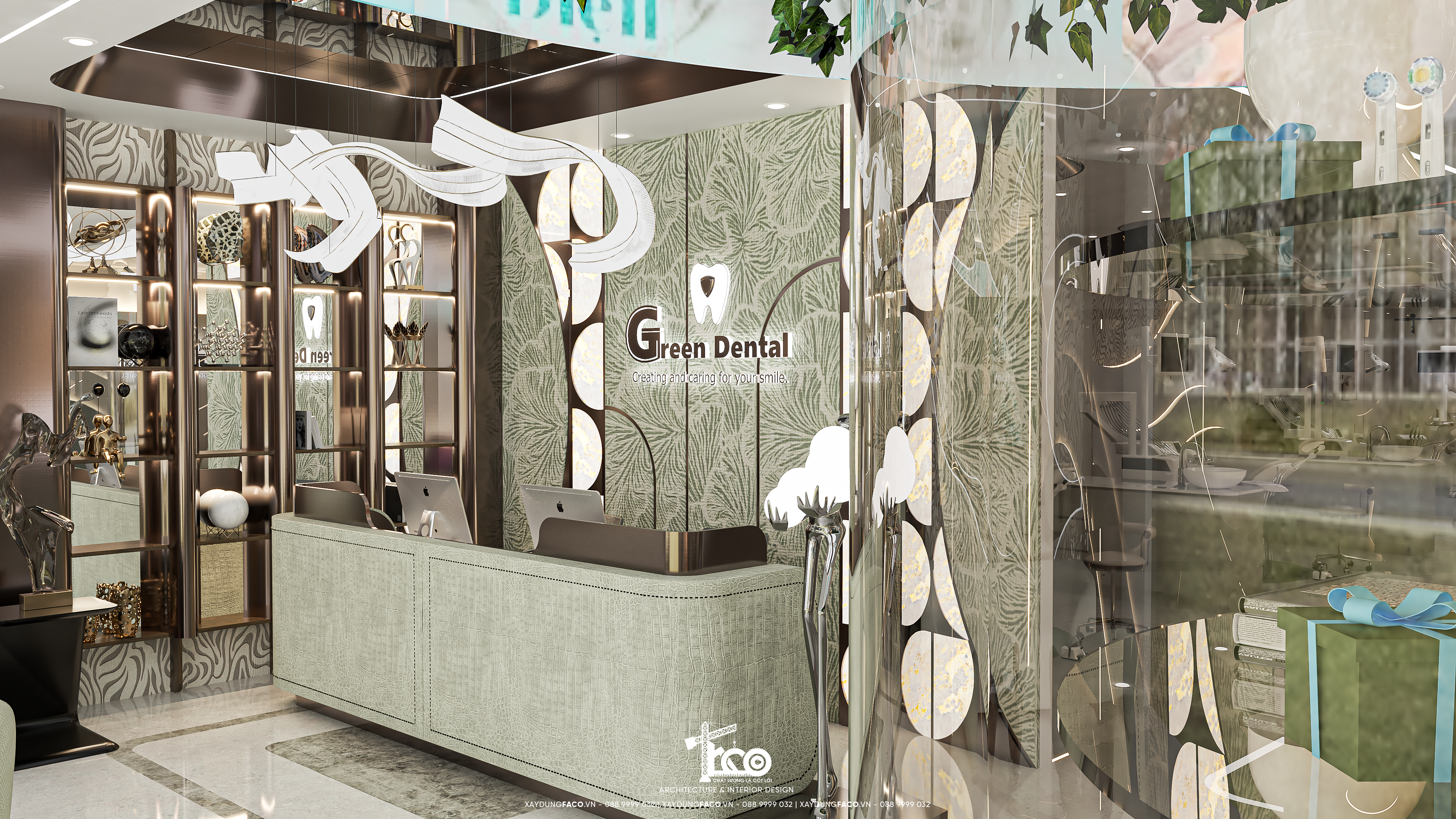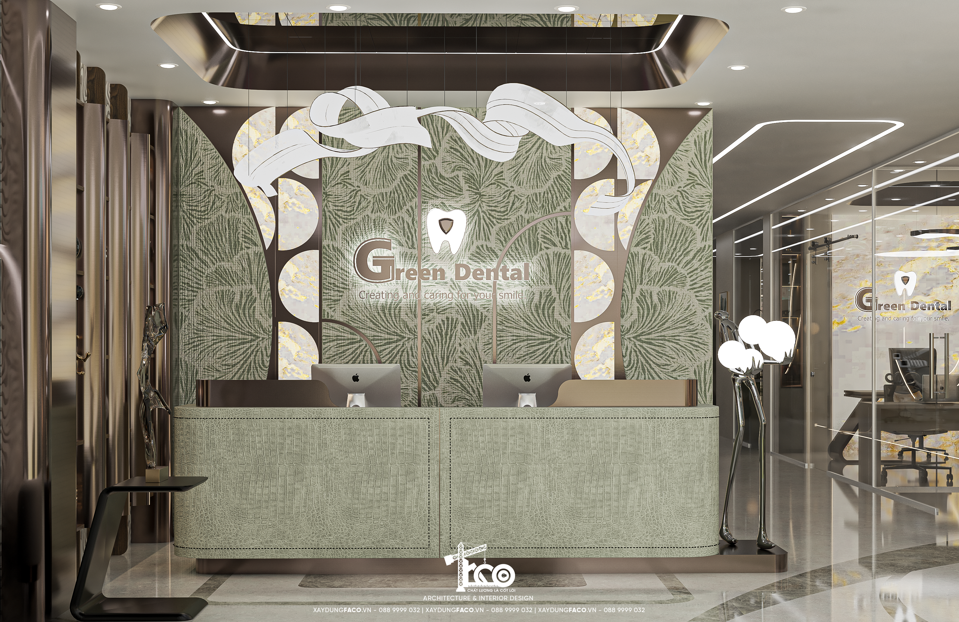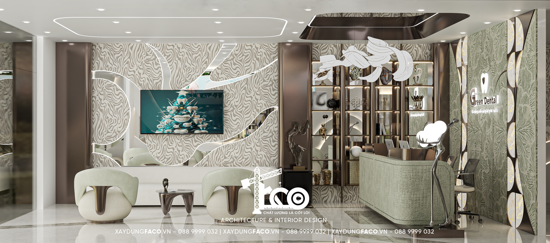 Với đội ngũ nhân sự chuyên môn cao và nhạy bén trong việc nắm bắt xu hướng của Faco Design & Build, chúng tôi không chỉ xây dựng các mảng tường, hơn cả, chúng tôi kiến tạo cảm xúc. Và Green Dental chính là một trong những minh chứng cho việc tạo ra không gian y tế chuẩn mực hoàn toàn có thể đẹp như một khách sạn 5 sao.