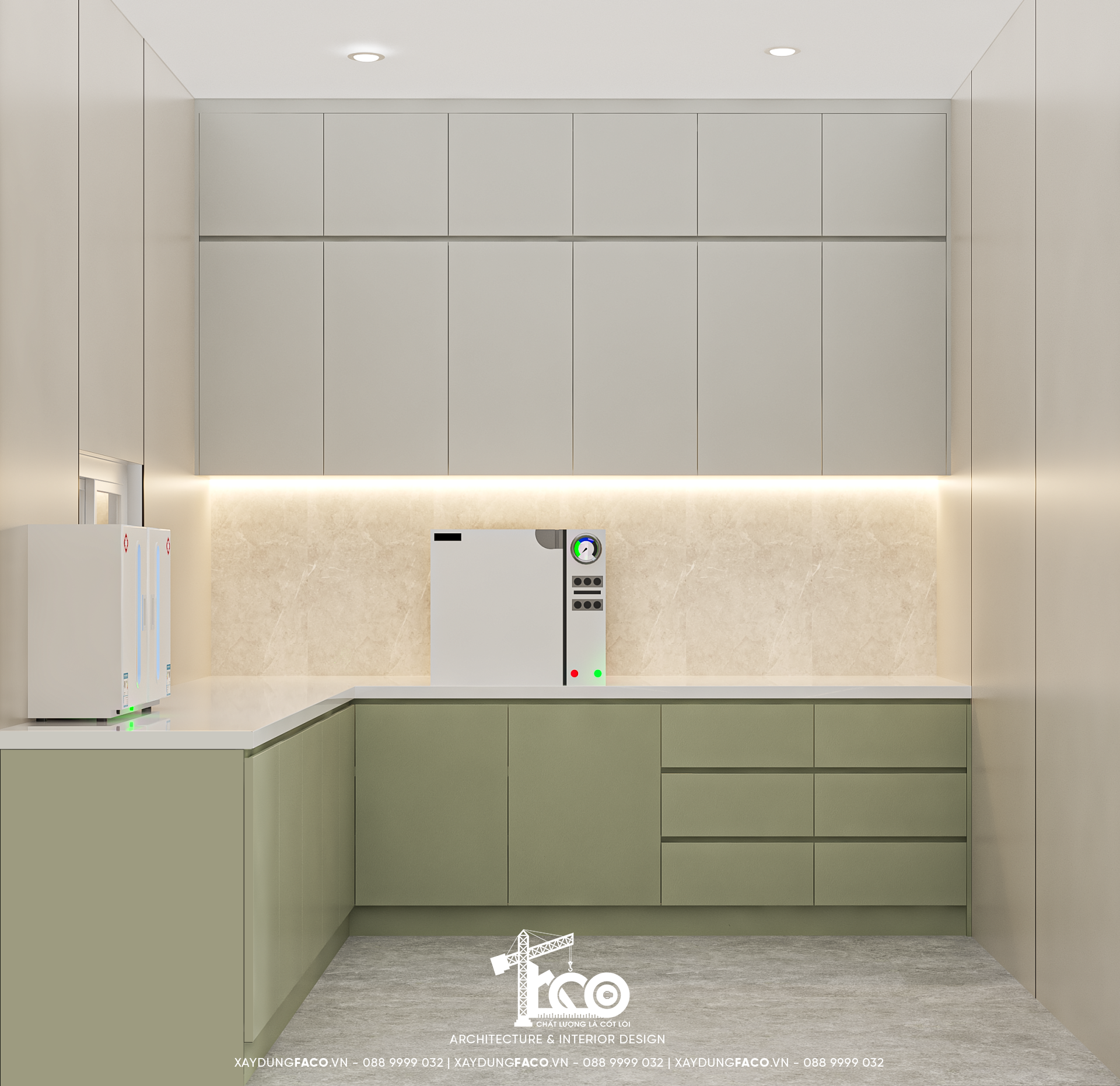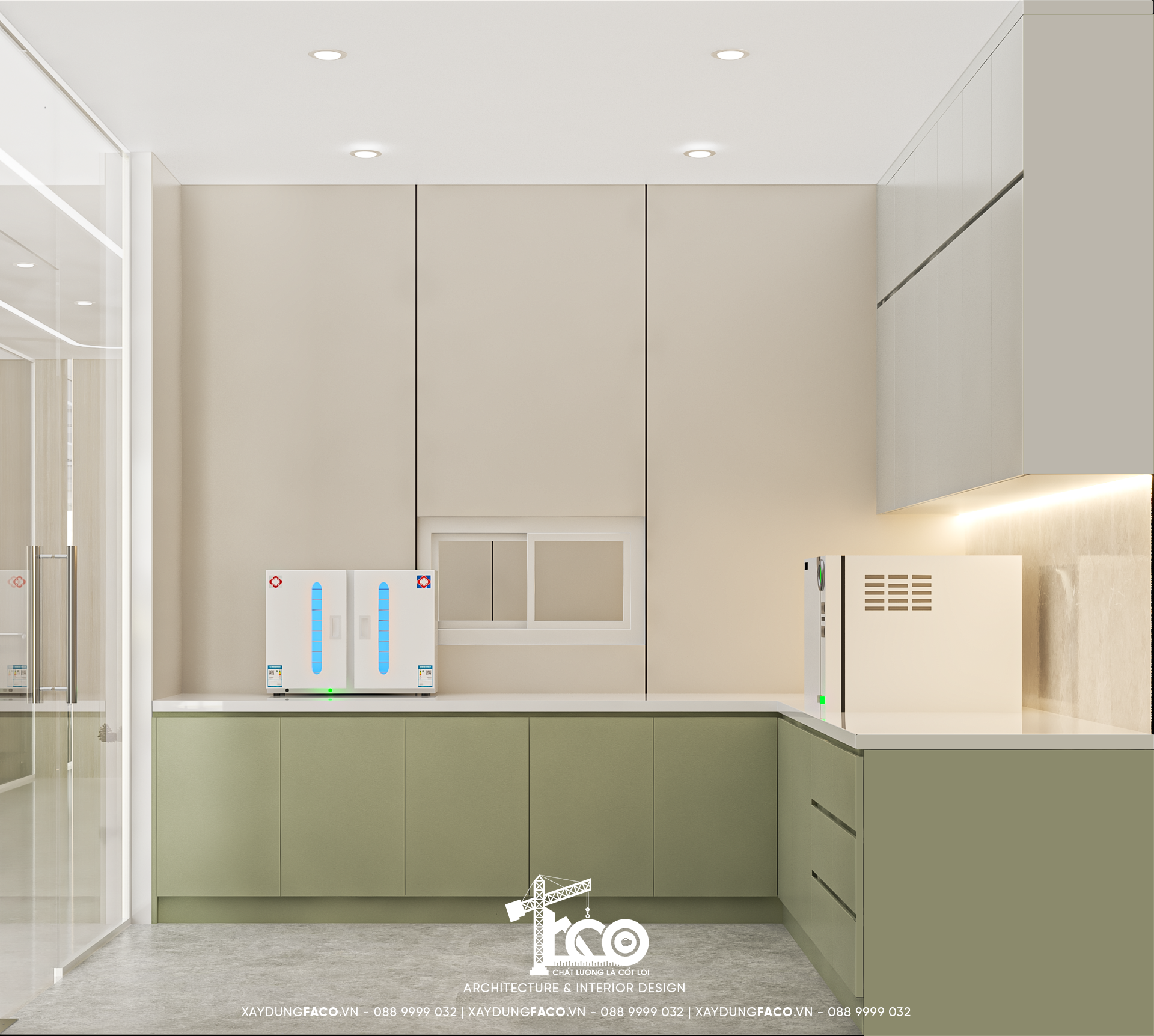Faco Design & Build hiểu rằng, với một phòng khám nha khoa, khu vực vô trùng là “trái tim” của sự an toàn. Hệ tủ màu xanh dịu mắt, bề mặt kháng khuẩn, không tay nắm, giúp công tác vệ sinh trở nên đơn giản hơn. Các bồn rửa, nồi hấp tiệt trùng,… tất cả đều được bố trí theo nguyên tắc một chiều, ngăn chặn tối đa sự lây nhiễm chéo.