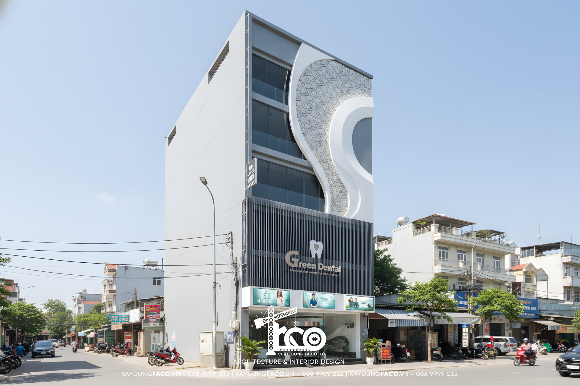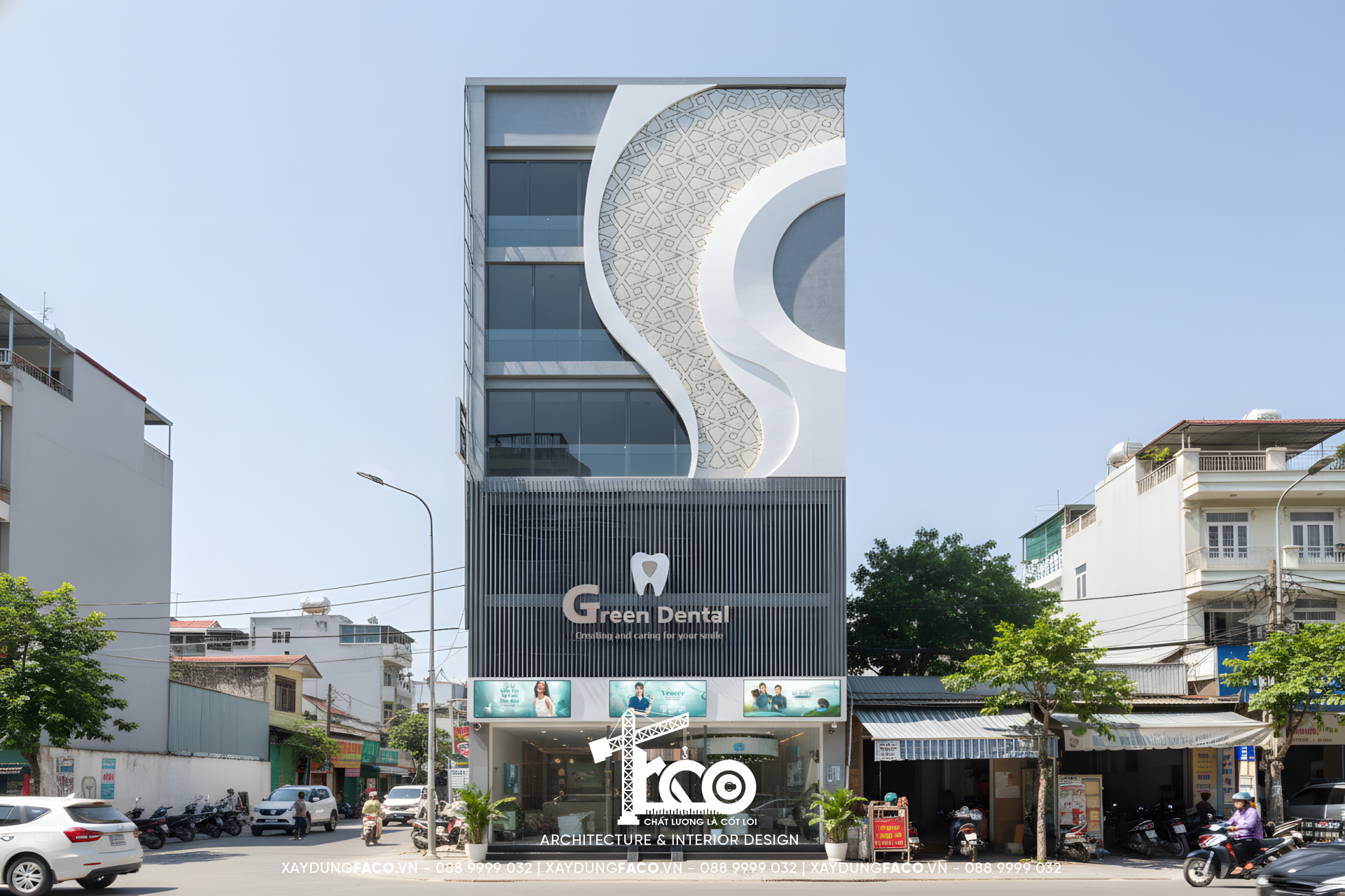 Ngay từ cái nhìn đầu tiên, mặt tiền của Green Dental đã tạo ra một lực hút thị giác mạnh mẽ, tách biệt hoàn toàn so với các công trình lân cận. Chúng tôi đã áp dụng phương pháp kiến trúc phân lớp, độc đáo, khác biệt và đầy cá tính.