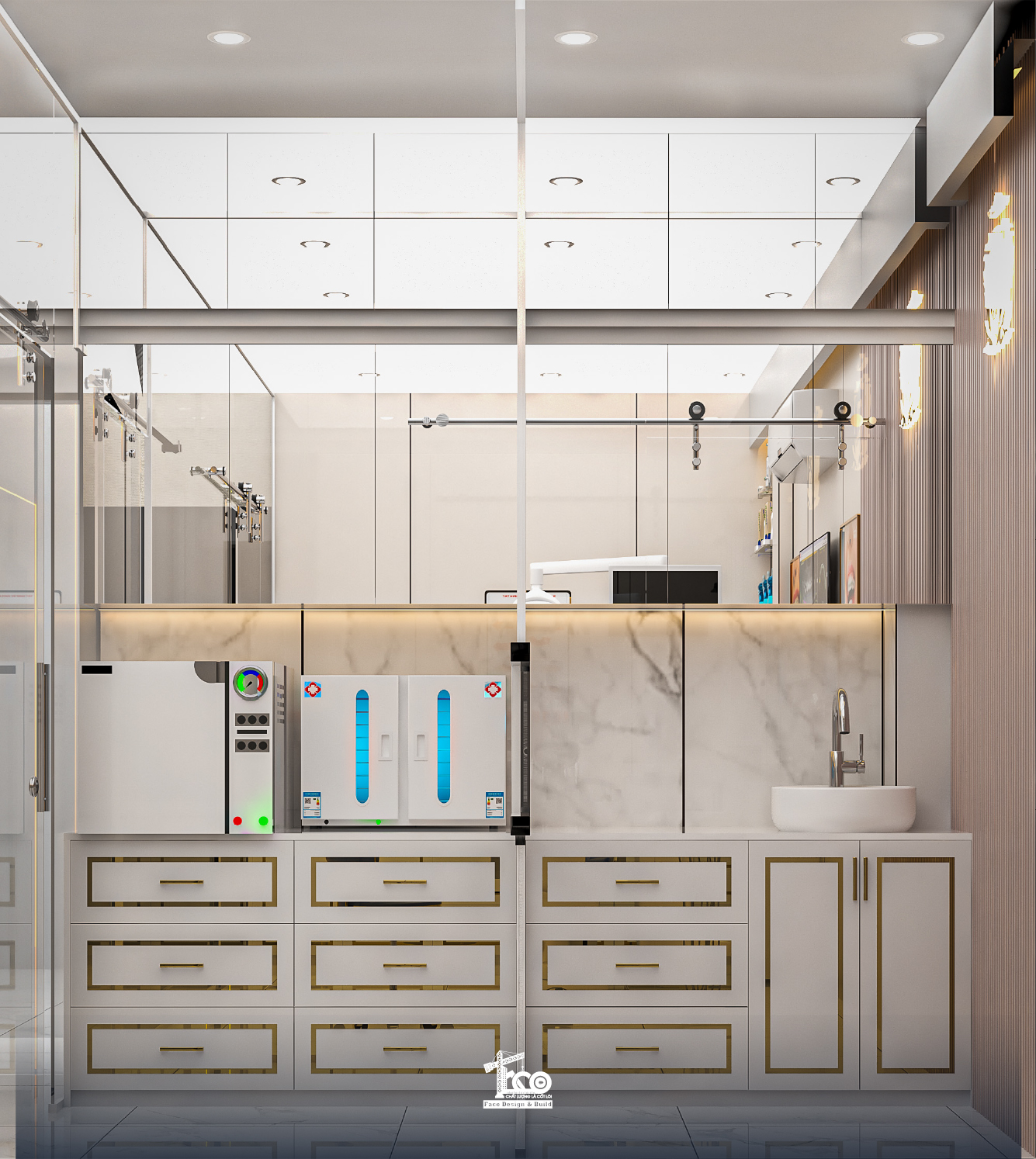 Hệ tủ lưu trữ nha khoa được thiết kế nhiều ngăn, mặt bàn đá nhân tạo trắng liền khối kèm bồn rửa tay bằng sứ âm bàn. Tay nắm tủ được thiết kế dạng thanh mảnh mạ vàng, đồng bộ với concept sang trọng.