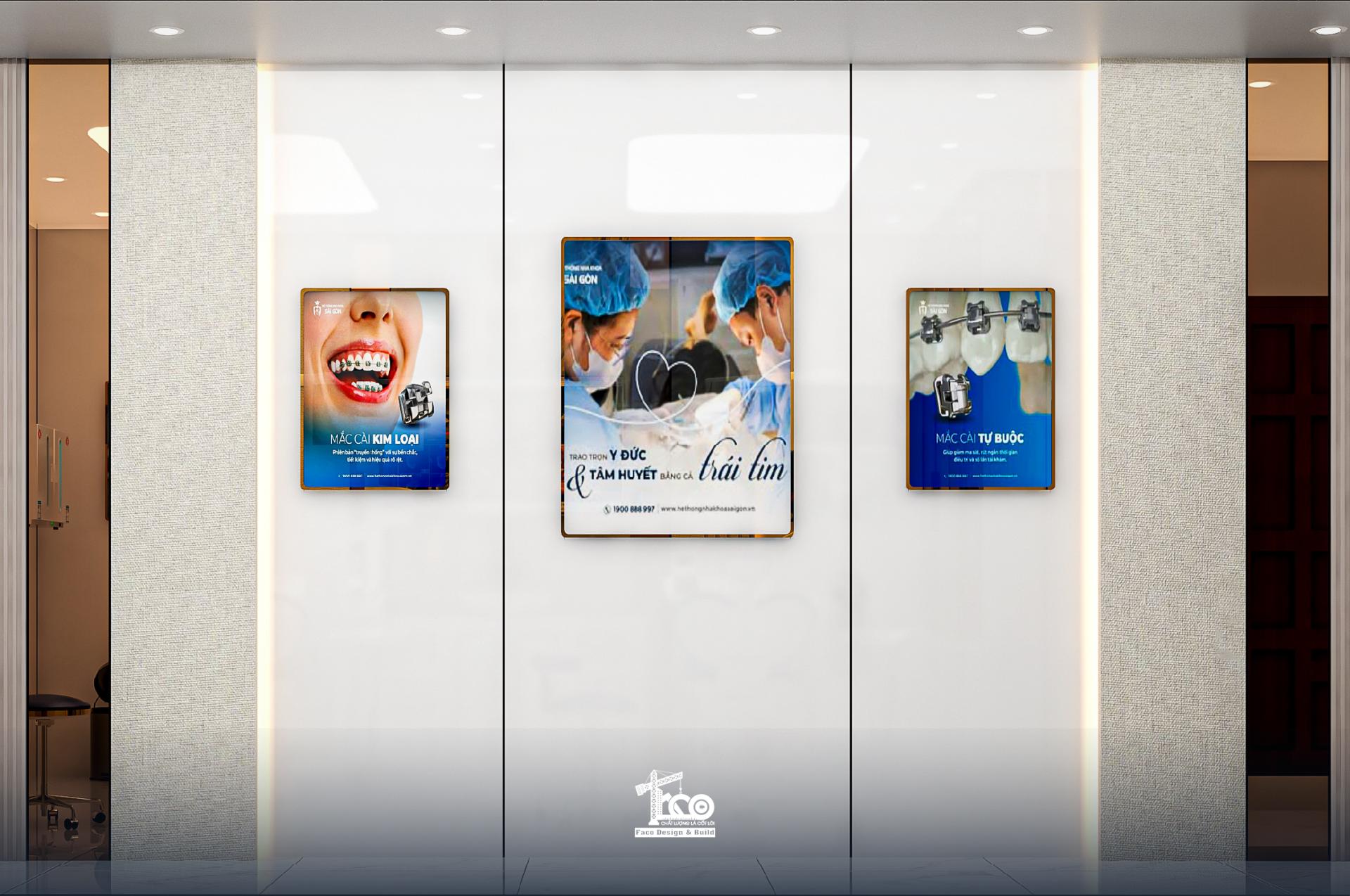 Trên tường hành lang, các màn hình quảng cáo liên quan đến nha khoa như niềng răng, Implant,… được bố trí vừa tầm mắt, tinh tế, biến lối đi thành một phòng trưng bày nghệ thuật truyền thông thương hiệu nhẹ nhàng.