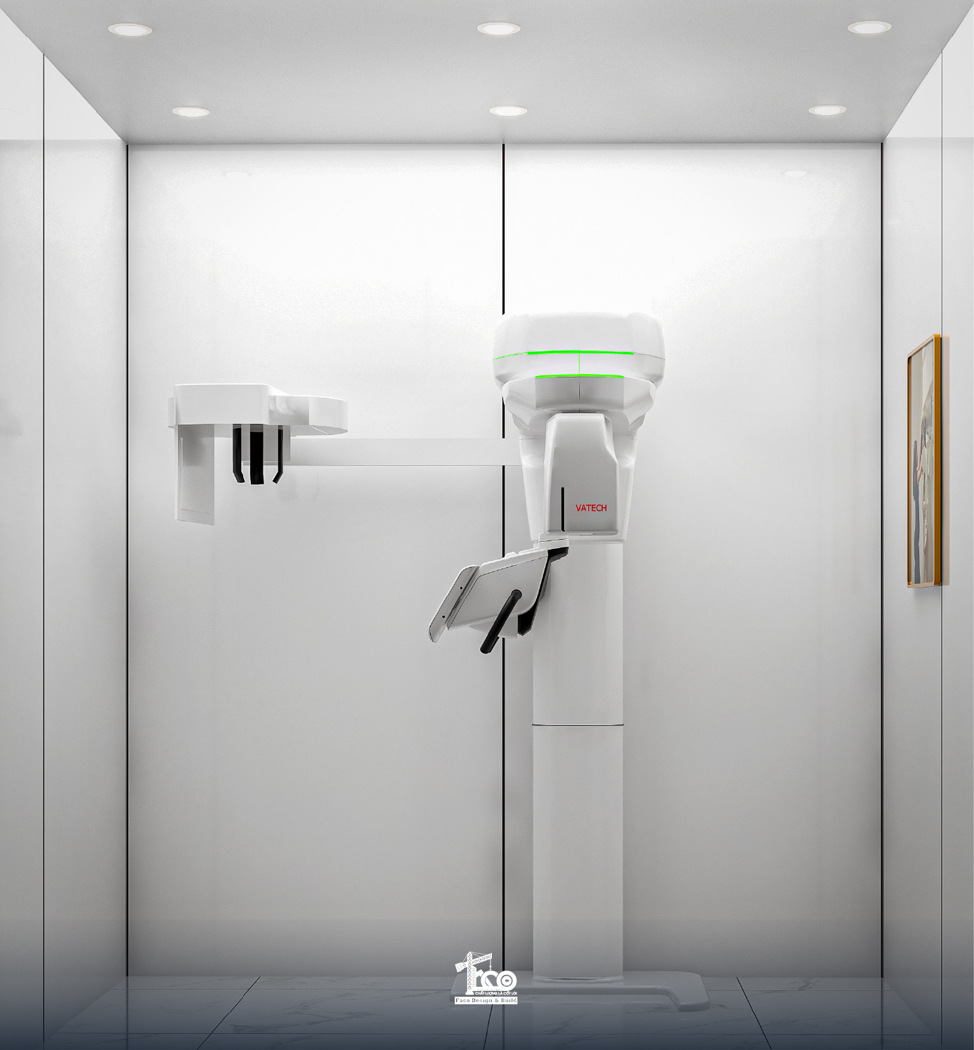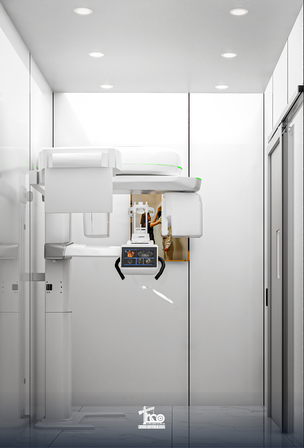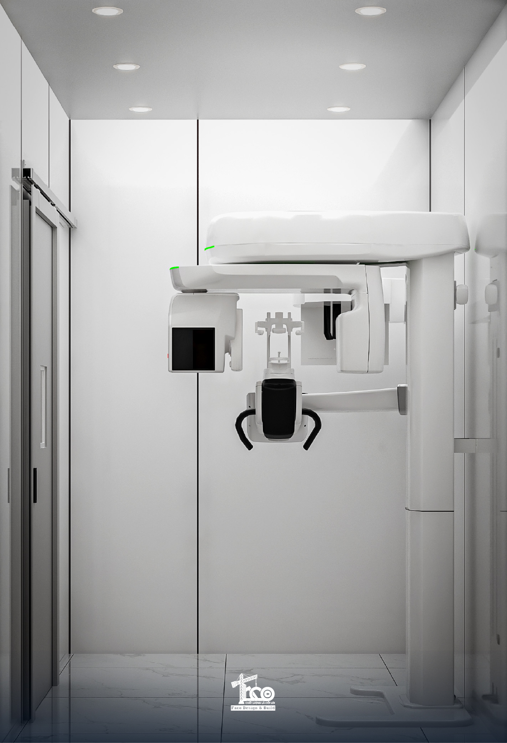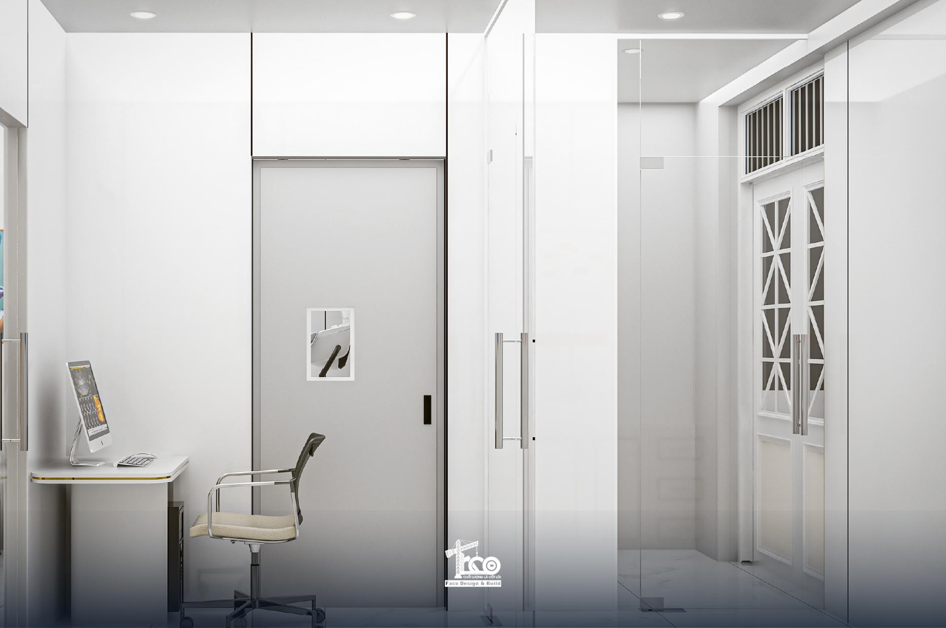 Phòng chụp X-quang được Faco Design & Build bố trí thành một không gian hoàn toàn khép kín để đảm bảo tiêu chuẩn an toàn bức xạ của Bộ Y tế. Căn phòng được thiết kế tone trắng tối giản, tập trung vào hệ thống thiết bị máy móc tiên tiến, cửa phòng dạng cửa trượt, đảm bảo cách ly tia X hoàn toàn với bên ngoài.