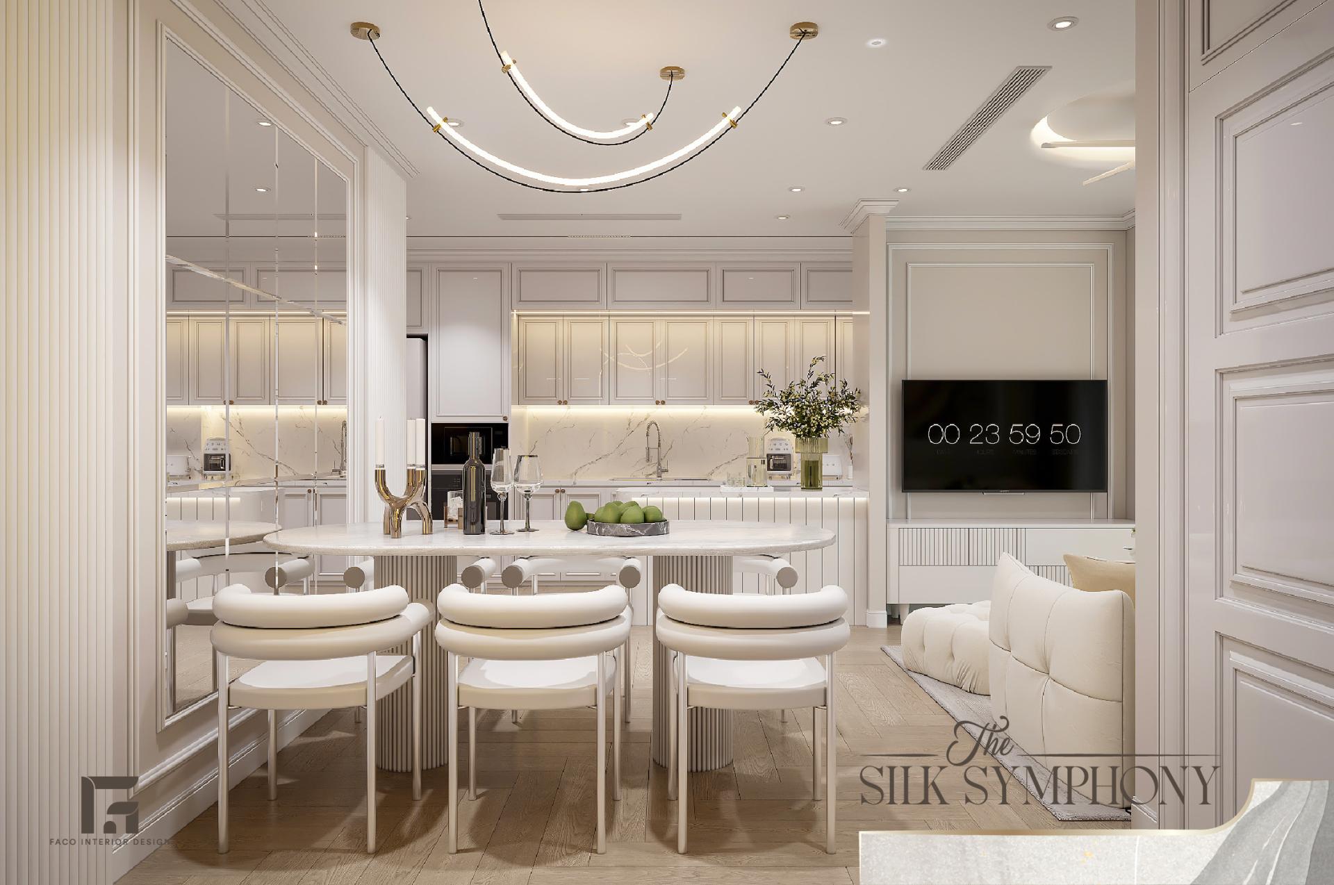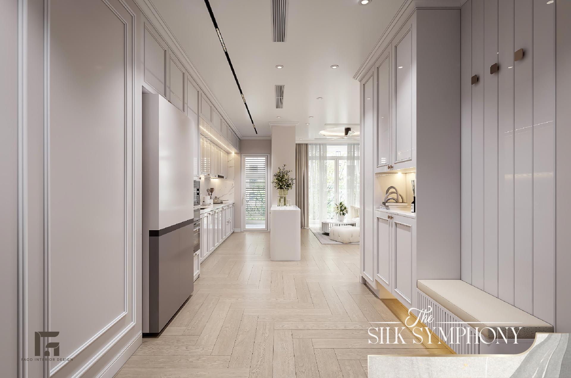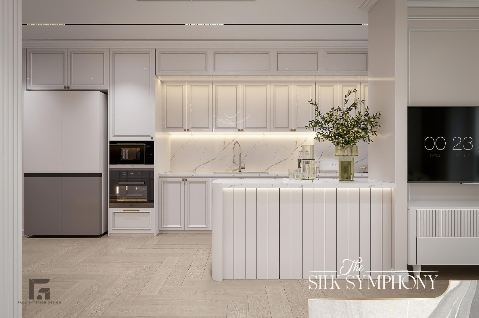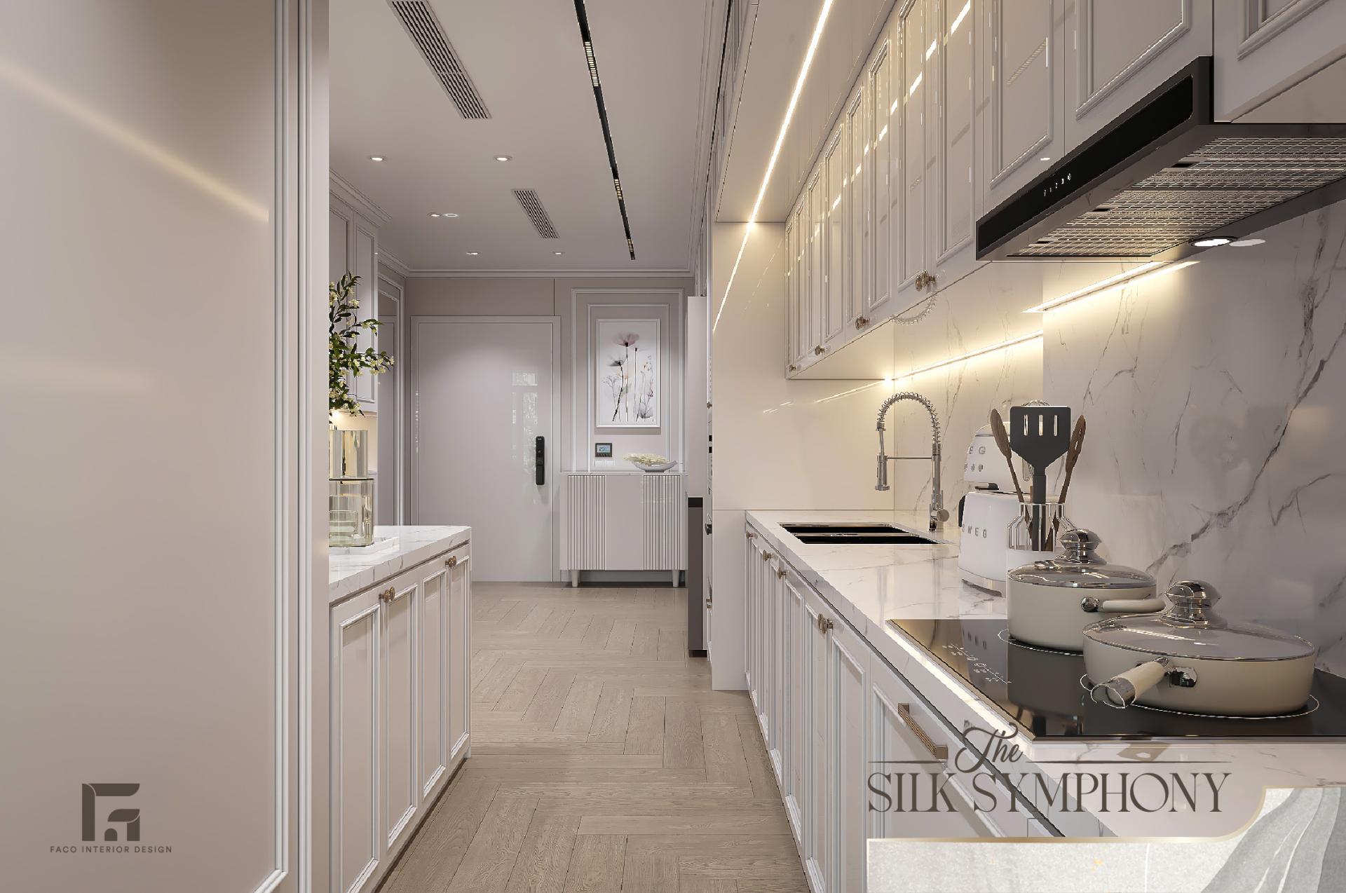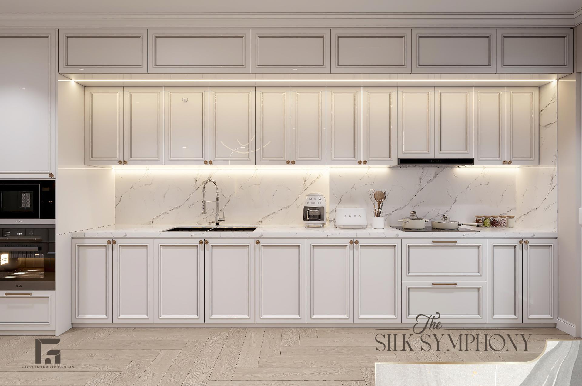 Không gian bếp của The Silk Symphony đã được thiết kế cá tính, hiện lên như một khu trưng bày thiết bị gia dụng cao cấp. Hệ tủ bếp chữ I kịch trần với các cánh tủ dập phào chỉ mang lại sức chứa khổng lồ nhưng vẫn duy trì được vẻ đẹp bên ngoài khá thanh thoát. Tone màu trắng tiếp tục được chúng tôi sử dụng trong gian bếp, giúp tạo cảm giác sạch sẽ và tinh tươm.