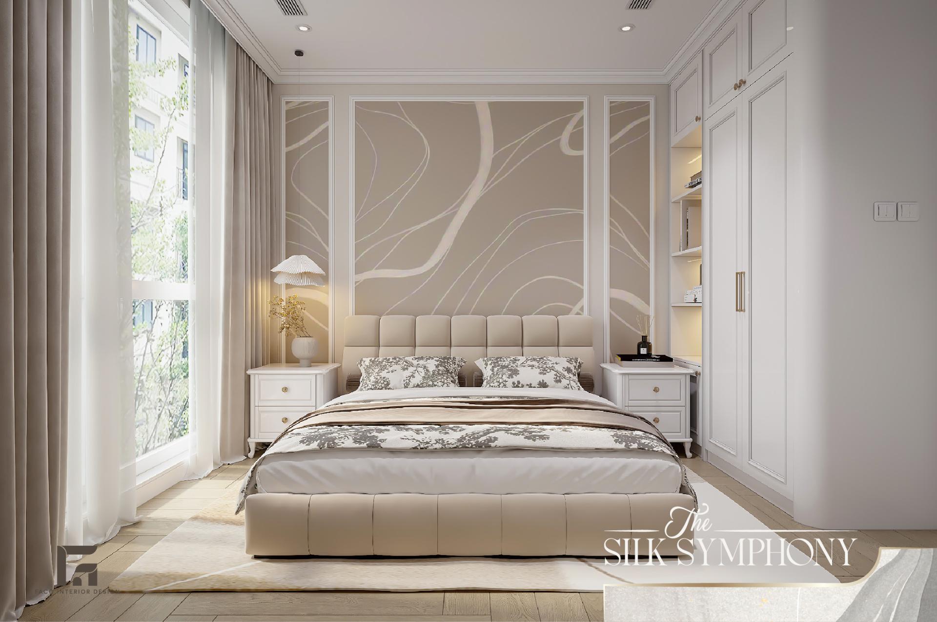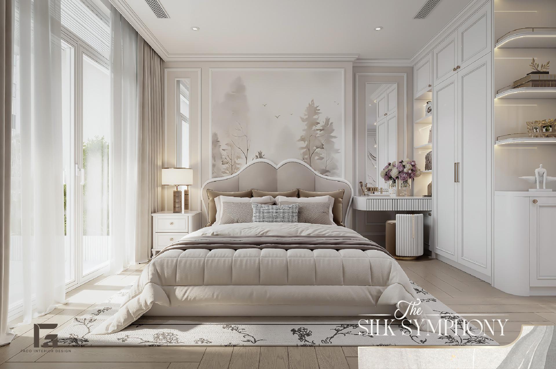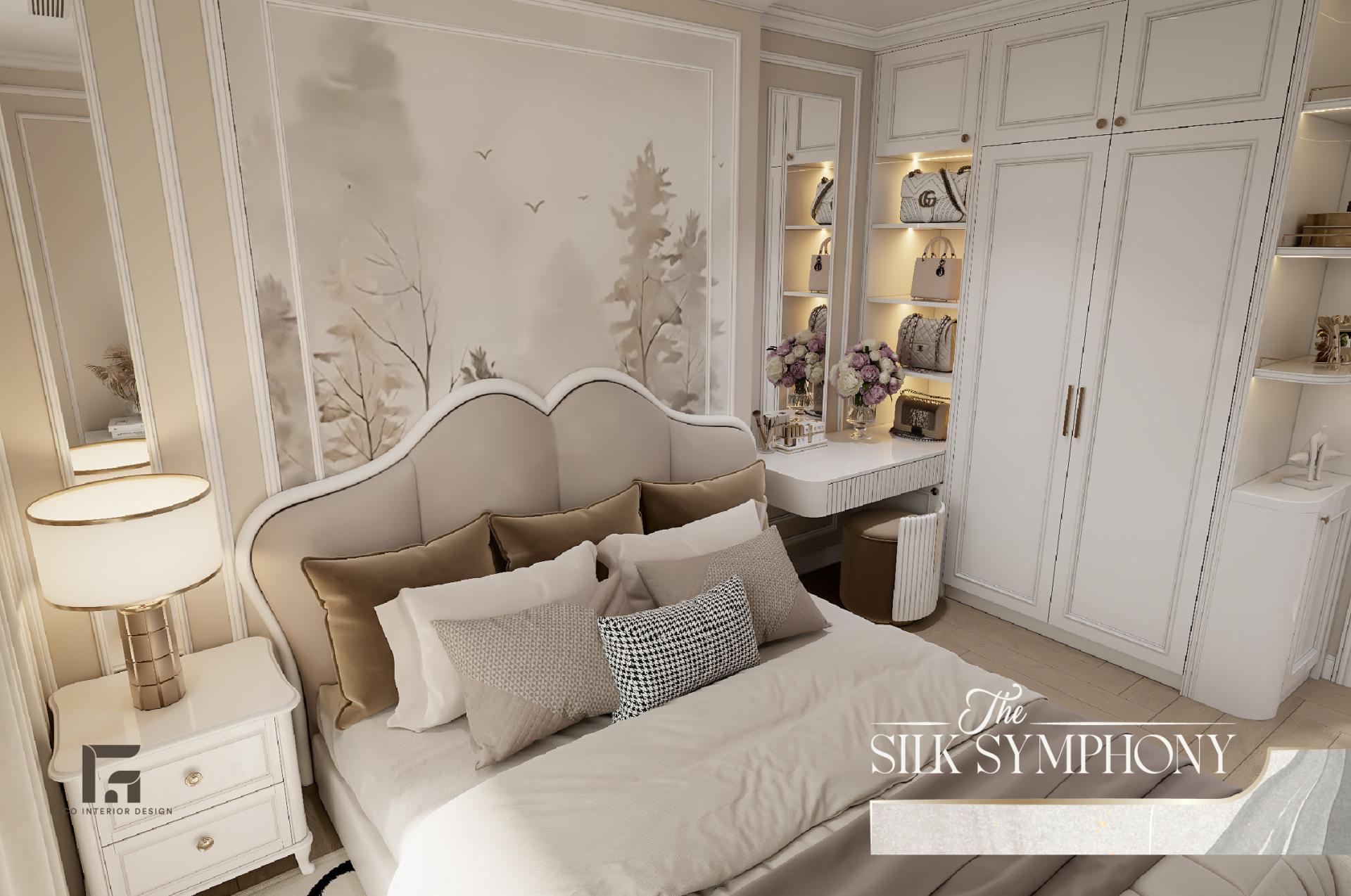Phòng ngủ tại The Silk Symphony là một thế giới hoàn toàn cách biệt, là nơi gia chủ có thể tạm gác lại mọi bộn bề để chìm đắm trong sự thư thái. Thay vì để mảng tường trống, chúng tôi đã decor căn phòng bằng bức tranh mang họa tiết rừng cây sương mù ẩn hiện, gam màu pastel nhạt, giúp mang lại cảm giác bình yên, tĩnh tại và giúp cân bằng lại năng lượng sau ngày dài làm việc.