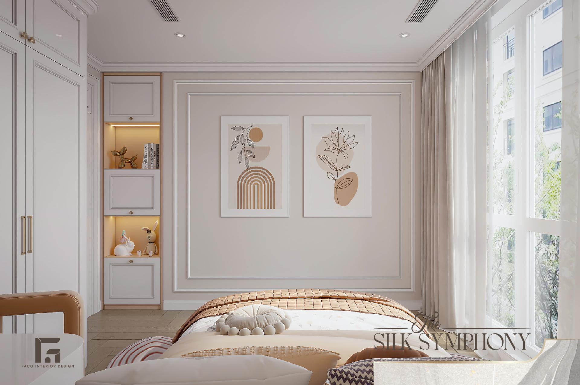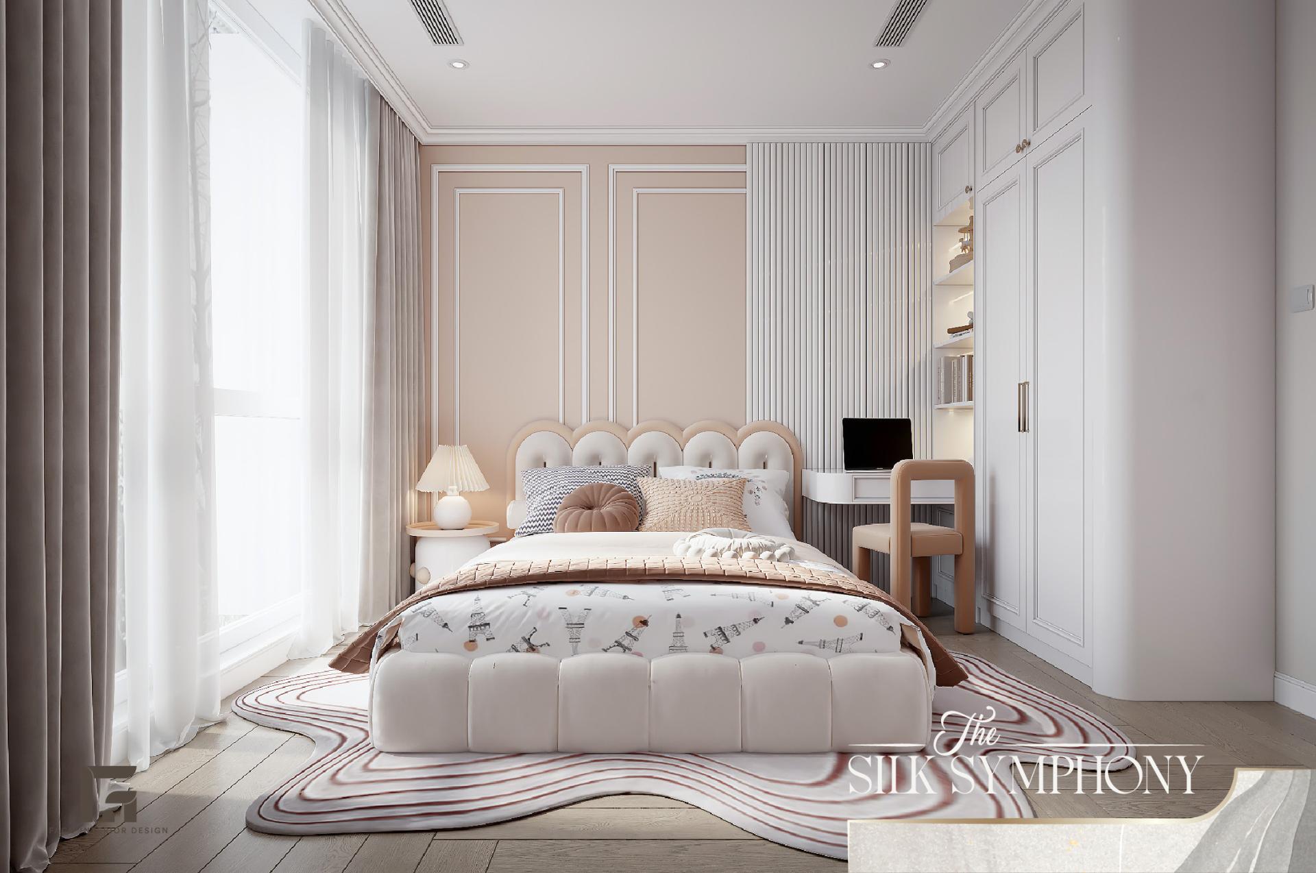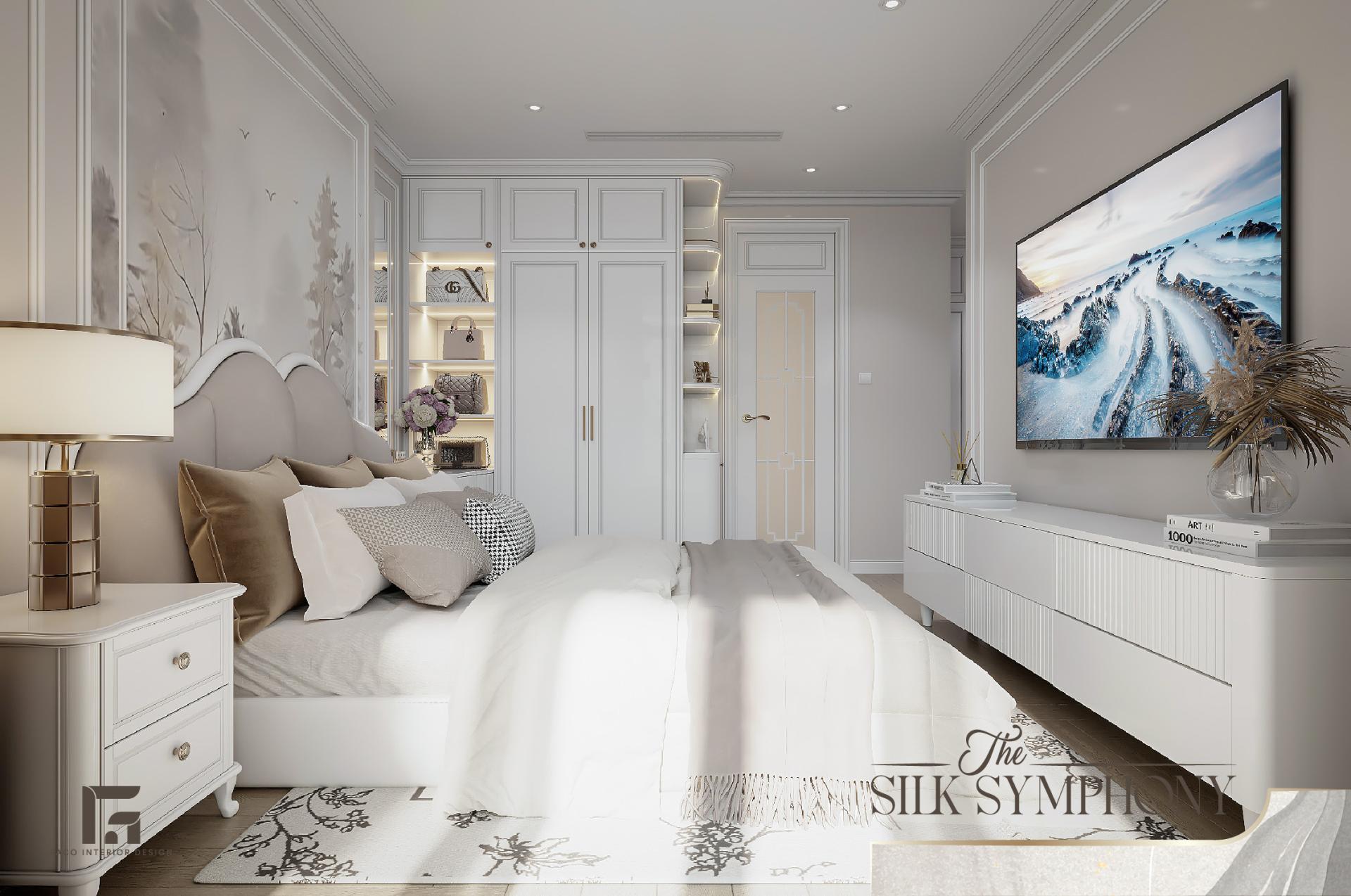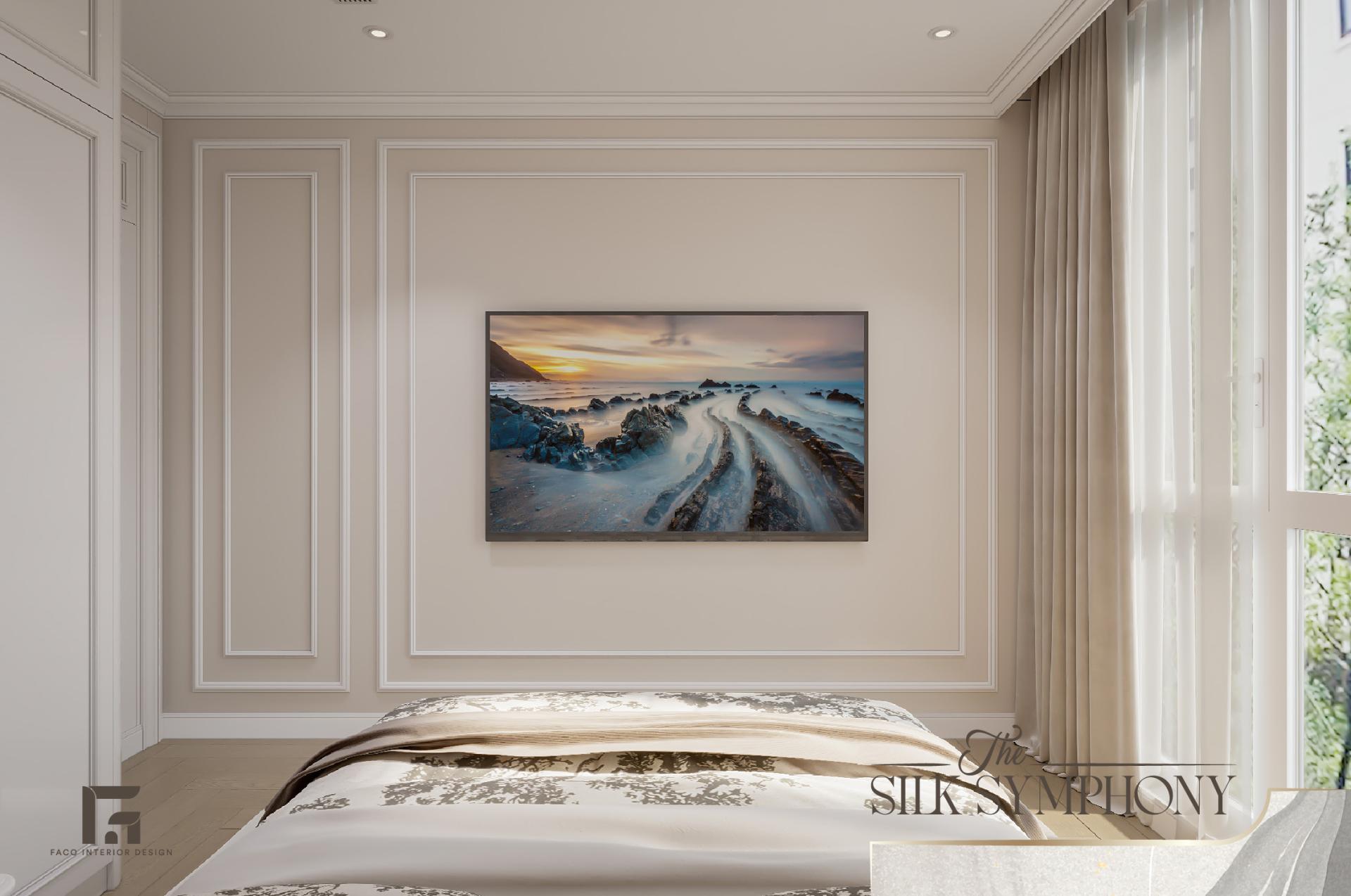 Phòng ngủ tại The Silk Symphony là một thế giới hoàn toàn cách biệt, là nơi gia chủ có thể tạm gác lại mọi bộn bề để chìm đắm trong sự thư thái. Thay vì để mảng tường trống, chúng tôi đã decor căn phòng bằng bức tranh mang họa tiết rừng cây sương mù ẩn hiện, gam màu pastel nhạt, giúp mang lại cảm giác bình yên, tĩnh tại và giúp cân bằng lại năng lượng sau ngày dài làm việc.