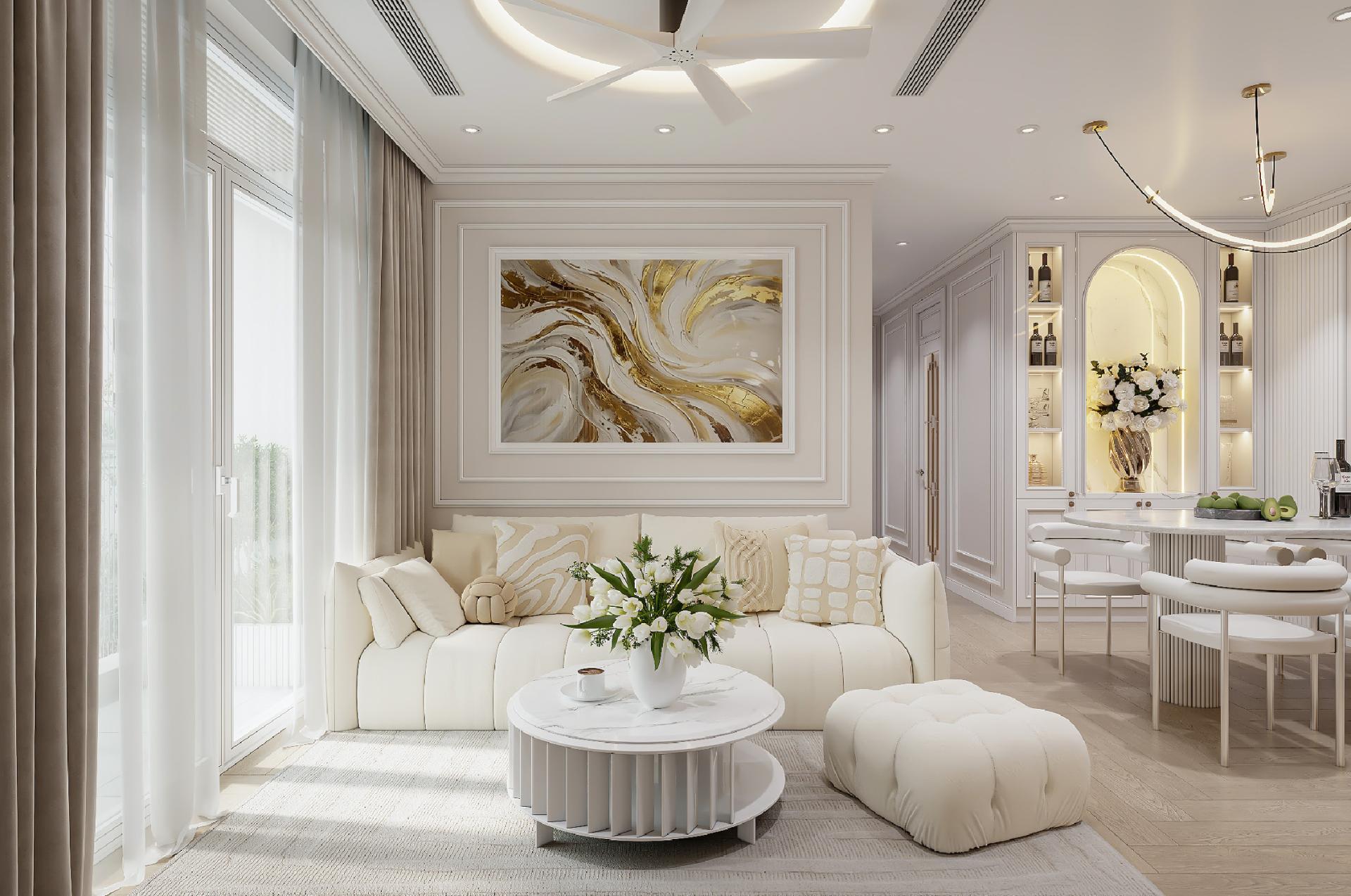 Mỗi góc nhỏ tại The Silk Symphony đều được chú trọng tỉ mỉ, được tính toán kỹ lưỡng cả về tỉ lệ, ánh sáng và vật liệu. Căn hộ nổi bật với tông trắng kem và be làm chủ đạo, mang lại hiệu ứng mở rộng cho không gian một cách tối đa. Hơn nữa, gam màu này sẽ giúp tạo nên tổ ấm thanh lịch và không bao giờ lỗi mốt theo năm tháng.