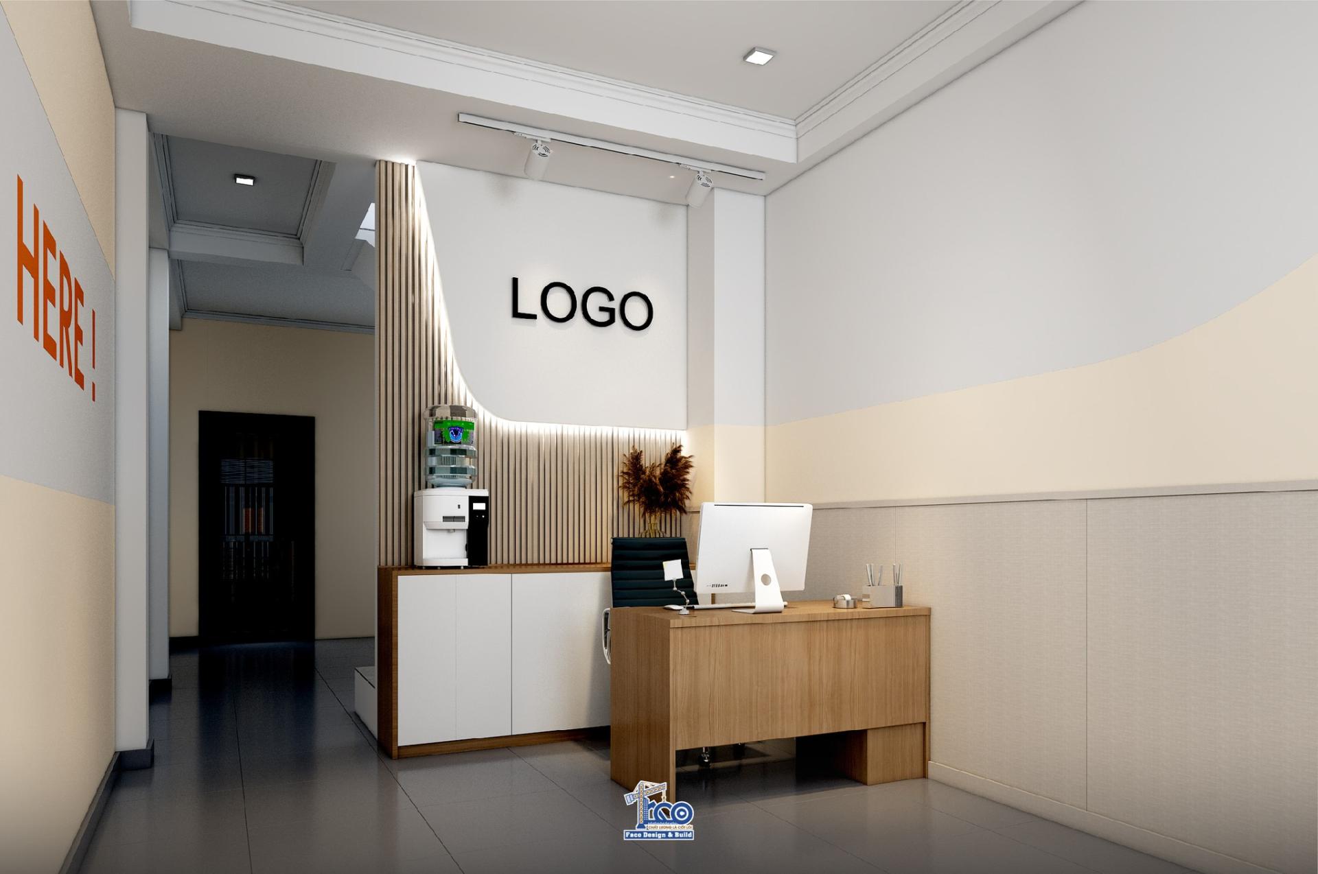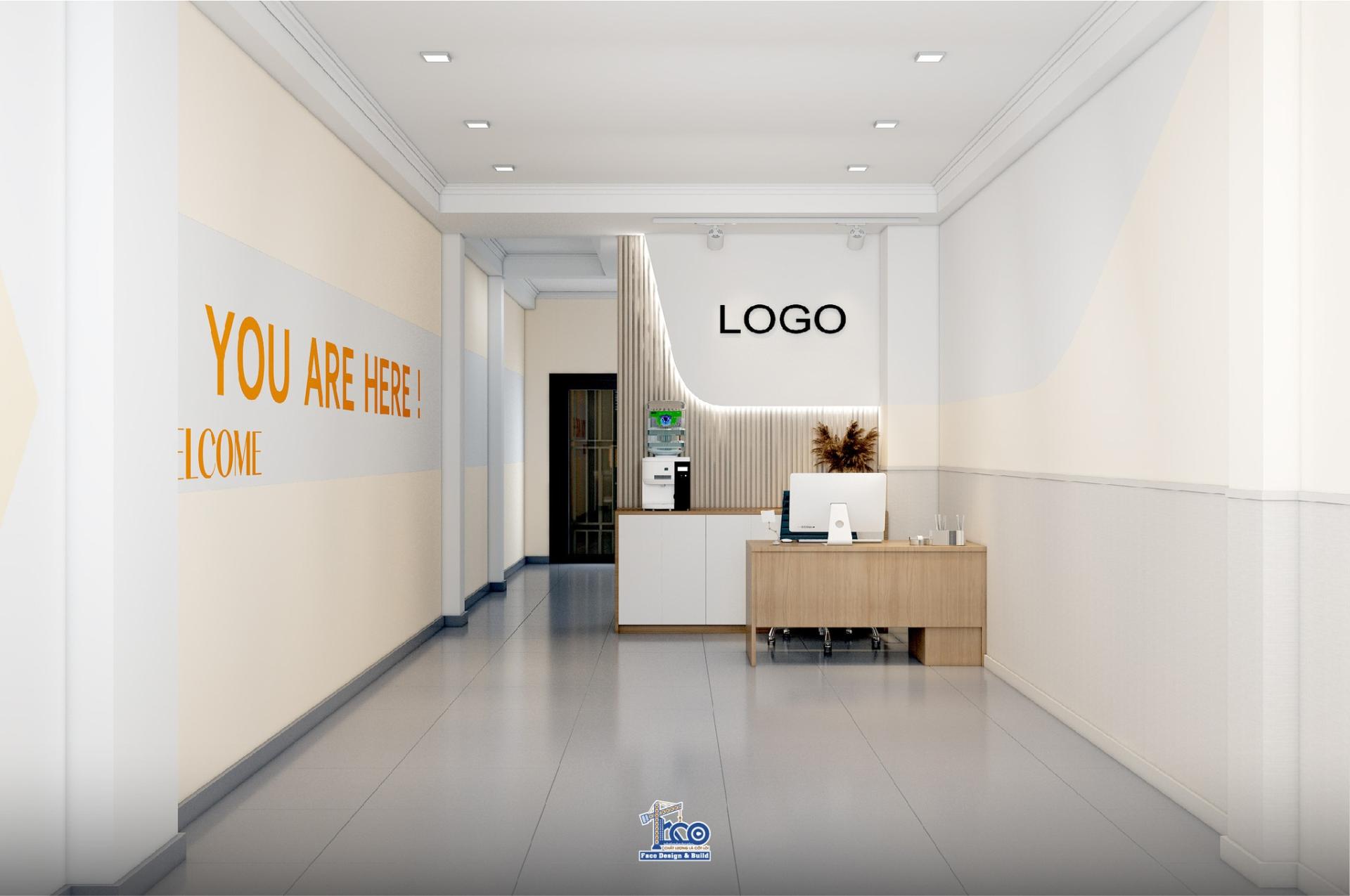Ngay từ khi bước vào, bạn sẽ cảm nhận được sự tinh tế và năng lượng tích cực bao trùm không gian. Khu vực lễ tân không quá lớn nhưng tất cả các chi tiết tại đó đều được thiết kế, sắp xếp một cách khoa học, rõ ràng và ấn tượng. Quầy lễ tân bằng gỗ veneer sáng, đường vân mềm mại, góc bo tròn vừa đủ để tạo cảm giác gần gũi và thân thiện. Mảng tường logo được nổi lên trên nền lam gỗ chạy dọc mang lại cảm giác rất sang trọng nhưng không xa cách.