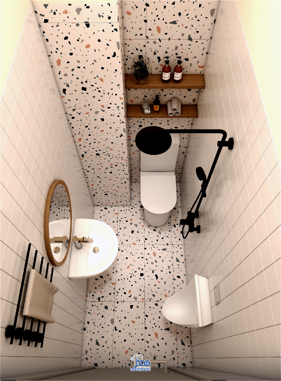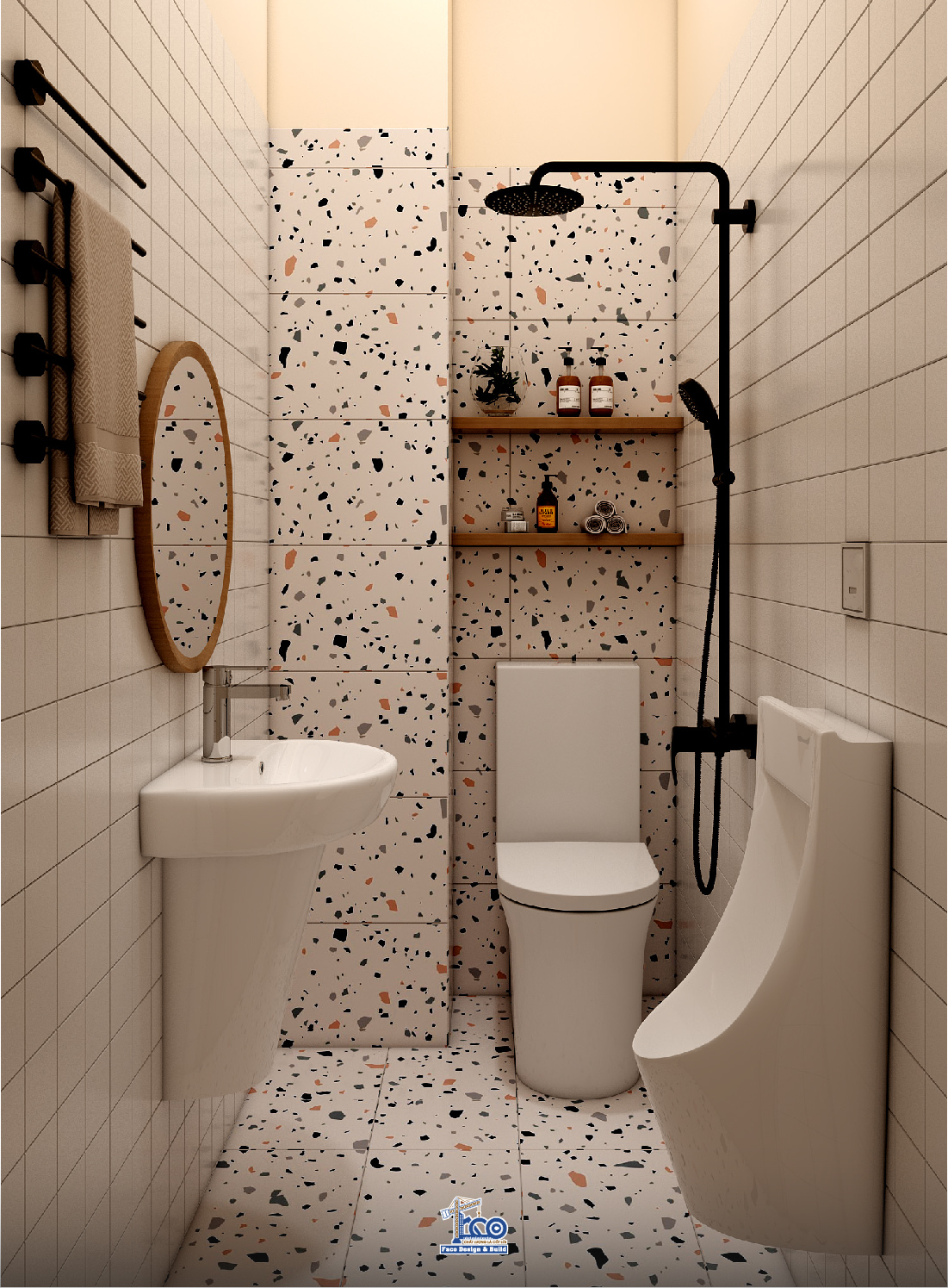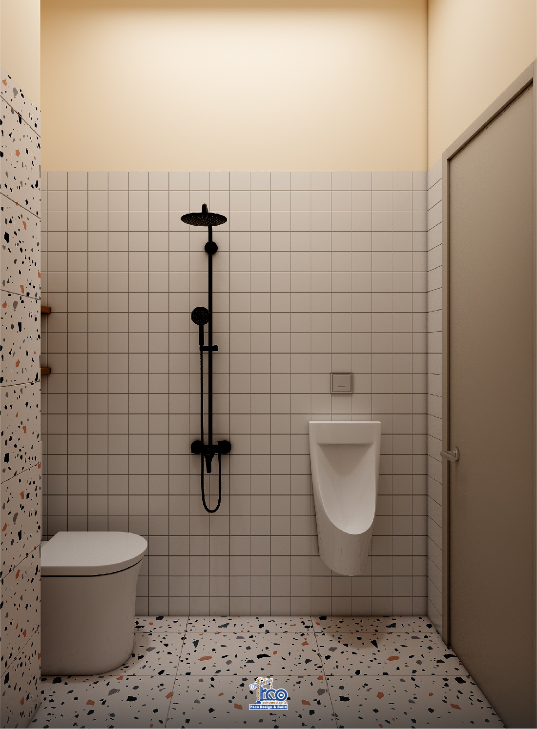 Trong mắt Faco Design & Build, văn phòng đẹp không chỉ ở khu vực làm việc, sảnh tiếp khách, phòng lãnh đạo,… mà còn được thể hiện qua những không gian ít được chú ý nhất, cụ thể là nhà vệ sinh. Diện tích nhà vệ sinh của văn phòng Mr. Khang không quá lớn, nhưng chúng tôi đã xử lý bố cục khéo léo, nền tường gạch Terrazzo kết hợp ánh sáng vàng nhẹ, giúp tăng chiều sâu hiệu quả.